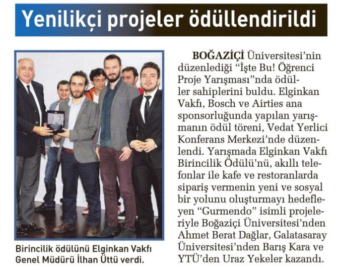 Programda birincilik ödülünü (30.000 TL); akıllı telefonlar ile kafe ve restoranlarda sipariş vermenin yeni ve sosyal bir yolunu sunan Gurmendo isimli projesiyle, Boğaziçi Üniversitesi’nden Ahmet Berat Dağlar, Galatasaray Üniversitesi’nden Barış Kara ve Yıldız Teknik Üniversitesi’nden Uraz Yekeler kazınmıştır.